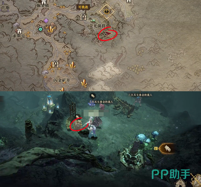 位于荧光菌群的右下角,三只耳兄弟会老熟人的左下角木制脚手架的旁边。