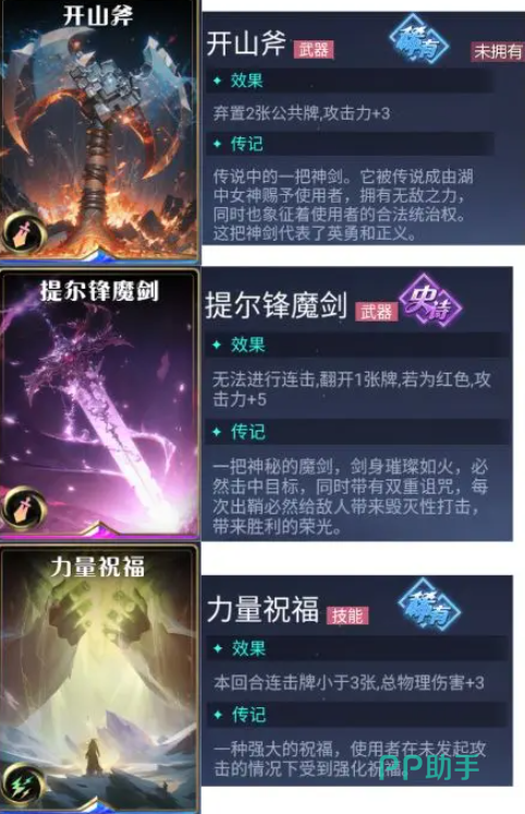 因为无法连击,直接配上开山斧和提尔锋魔剑,前者丢弃2个公牌加3攻,后者无法连击翻牌如果是红色攻击力加5,本身就无法连击这个效果也刚好合适。再配一张力量祝福。