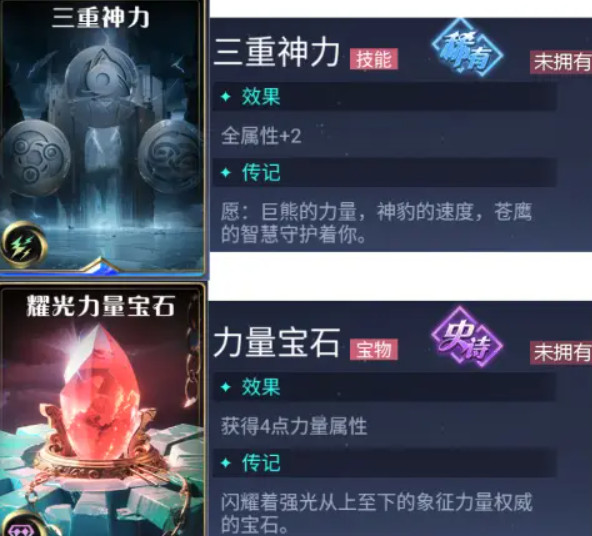 这里给大家分享一个思路,因为奇迹之力技能效果在这里,所以盘古肯定是走力量路线的,因此力量相关的卡是必拿的,比如说三重神力、耀光力量宝石、阿瑞斯之怒。