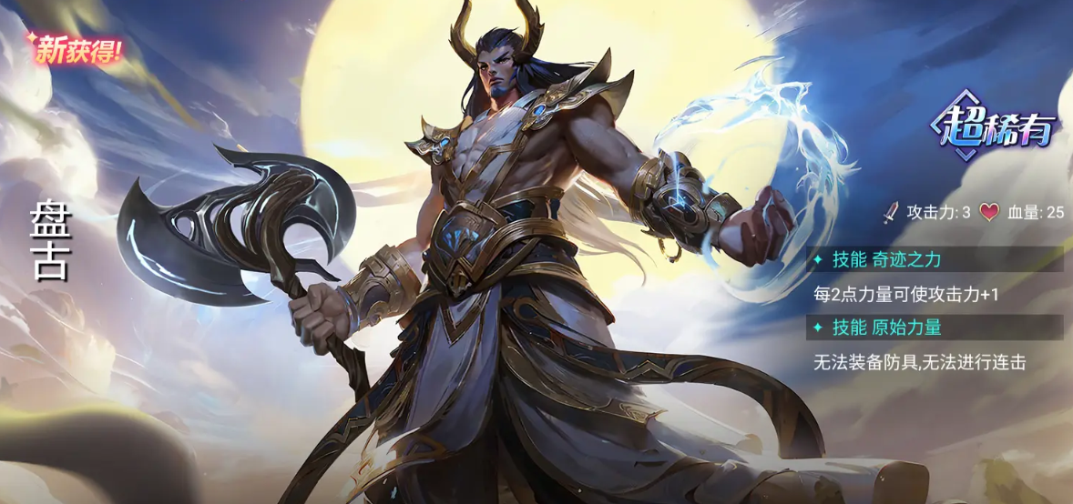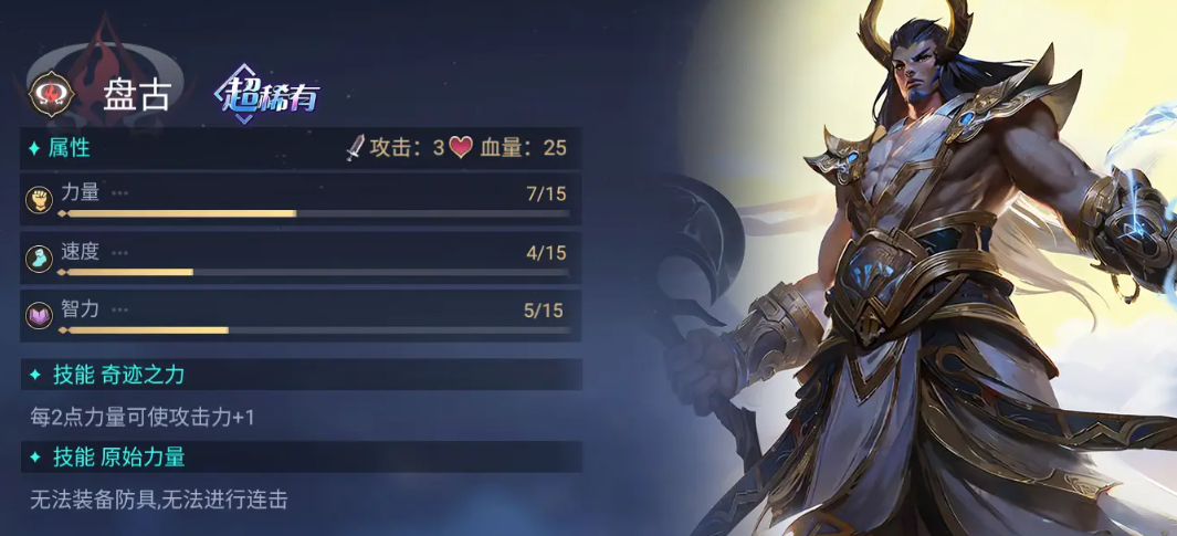 盘古初始有3点攻,25的削,7力4速5智,技能“奇迹之力”可以使其登场就有6点攻击力,非常高,如果搭配上连击岂不是可以直接打出惊人伤害。因为有些过于超模了,为了不破坏平衡体验,所以给盘古配了另一个自带的负面效果。