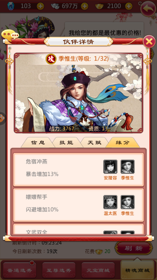 季惟生在搭配安陵容的时候是最佳搭配,可以激活百分之13的暴击几率,这个也是季惟生的核心缘分了,配合大招与装备天赋,最多可以达到百分之50多,算是必暴了。