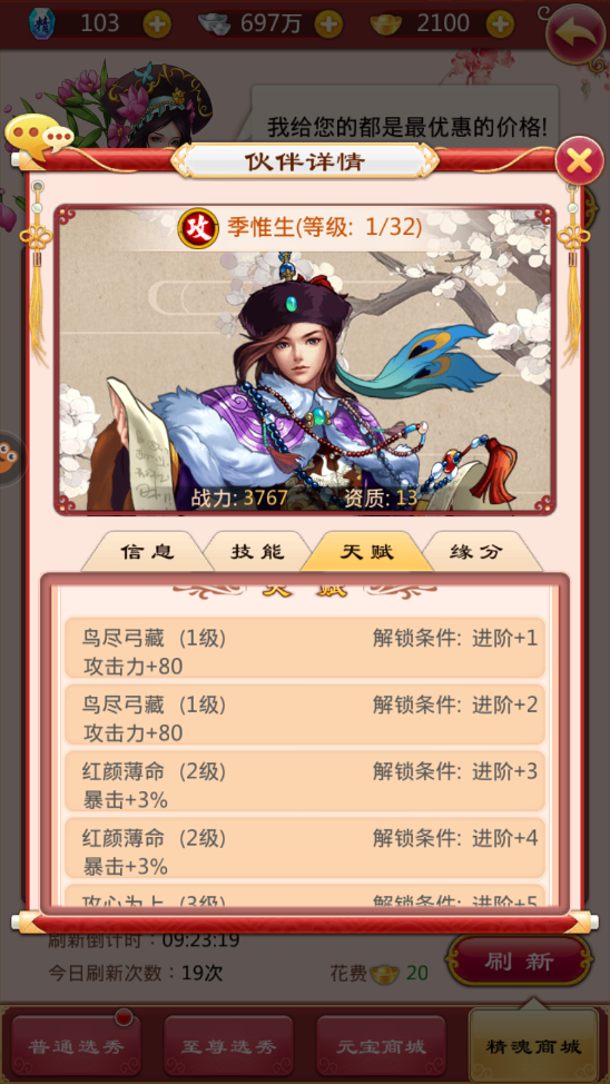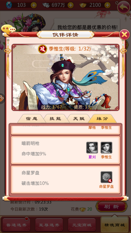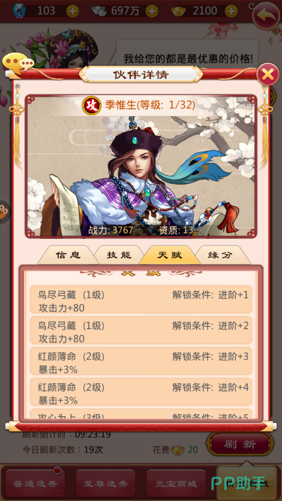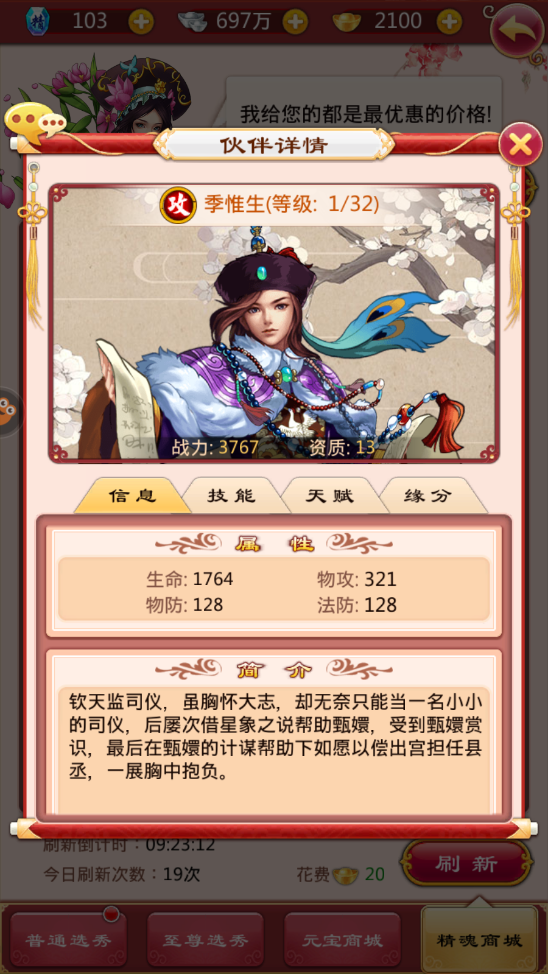 季惟生是一个橙色的角色,资质成长为13,双防有128点,而且生命有1764,可以作为我们的核心物理输出职业来对待。