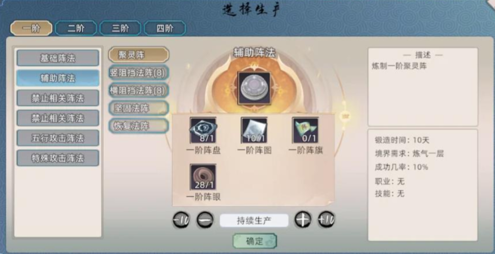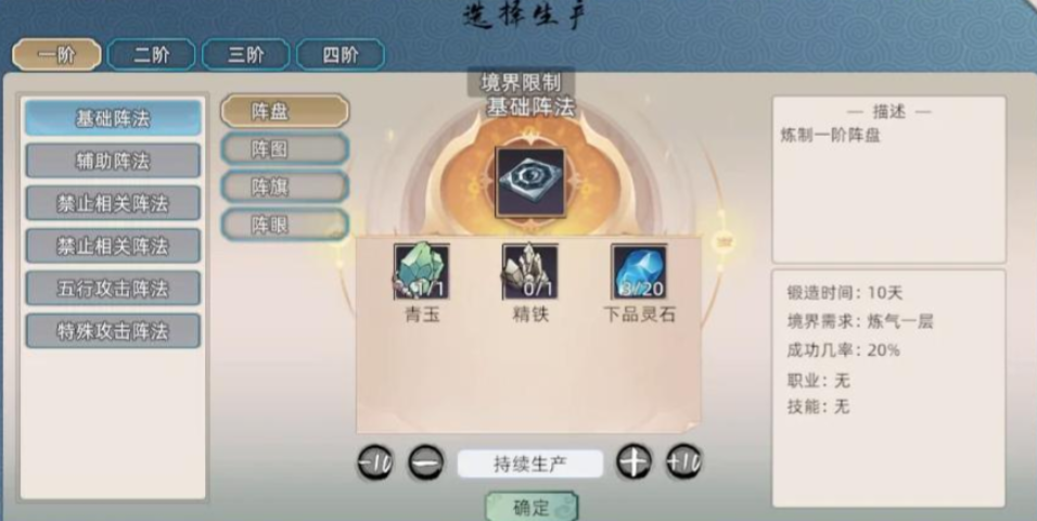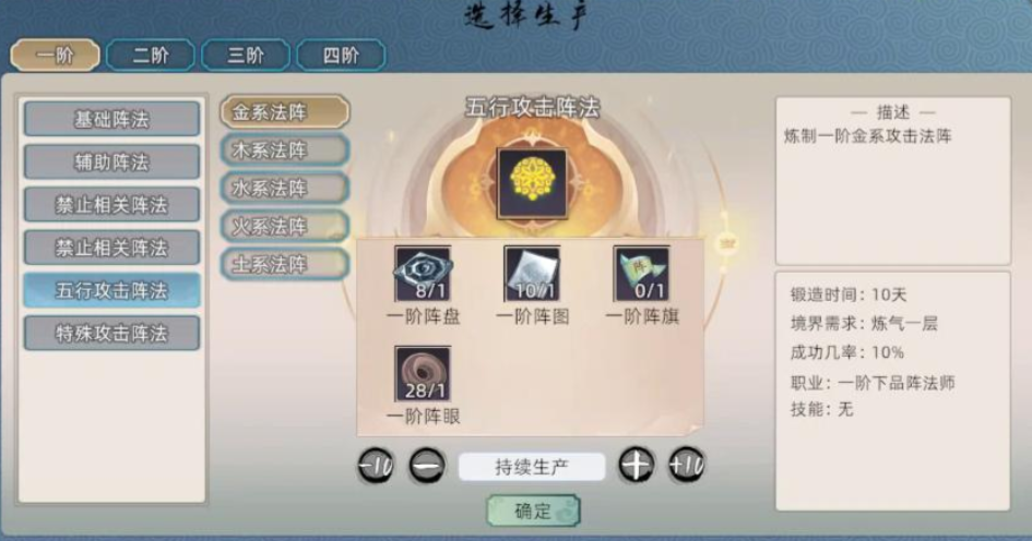 初期会赠送一些绑定阵法,便于去体验,炼制的规则与其他职业相似,只需消耗对应材料即可制作相应的阵法。阵法种类有很多,目前一共有九种阵法,而且每个都有1~5阶,对应不同境界,给到的属性增益也是随之提升的。