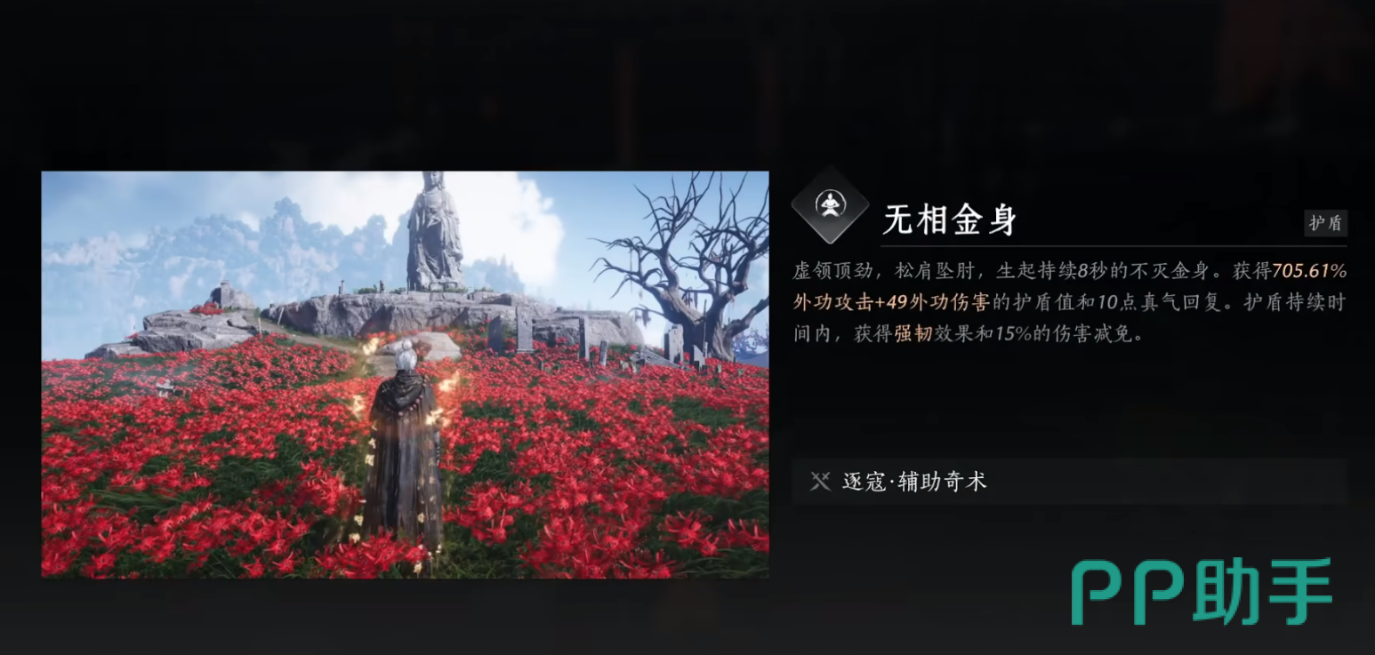 无相金身的效果是:虚领顶劲,松肩坠肘,生起持续8秒的不灭金身。获得705.61%的外功攻击+49%的外功伤害的护盾值和10点真气回复。护盾持续时间内,获得强韧效果和15%的伤害减免。在护盾持续期间,玩家还会获得强韧效果和减伤效果,使得你在战斗中更加坚韧,耐打。