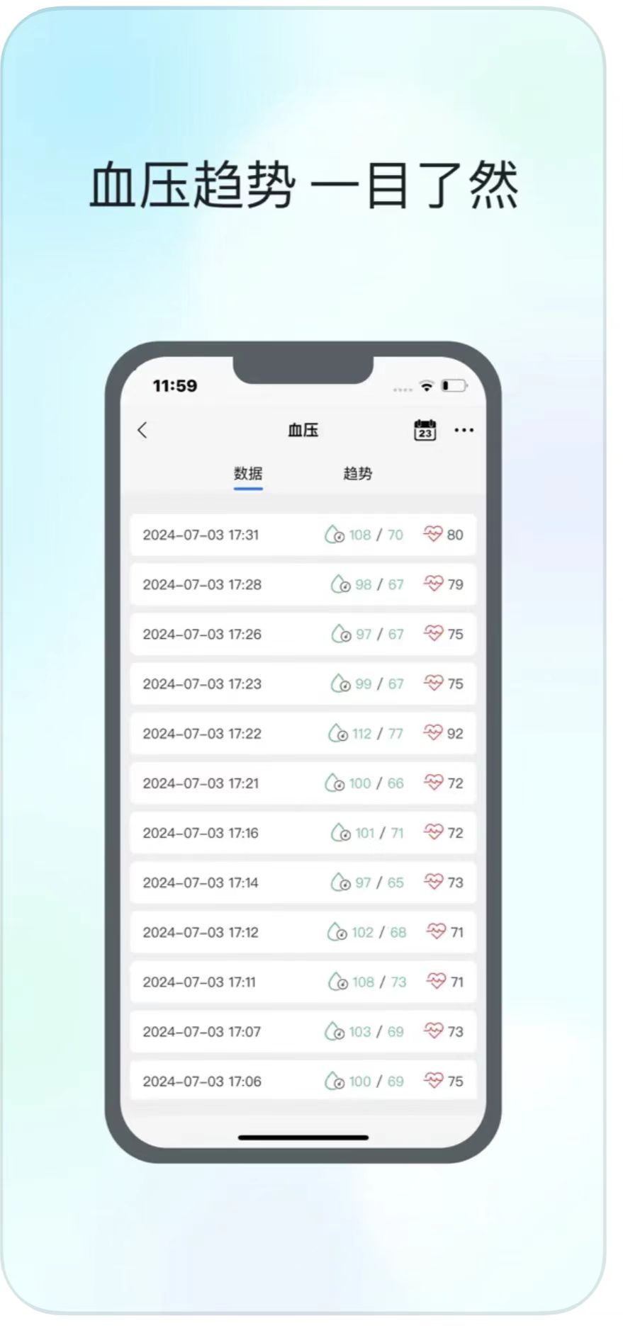 这款手表工具比较适合比较注重自己血压的小伙伴们,这里面的血压趋势是根据小伙伴们每日的不同时间的血压数值进行排列,小伙伴们可以很直观的看到自己的每天血压变化。