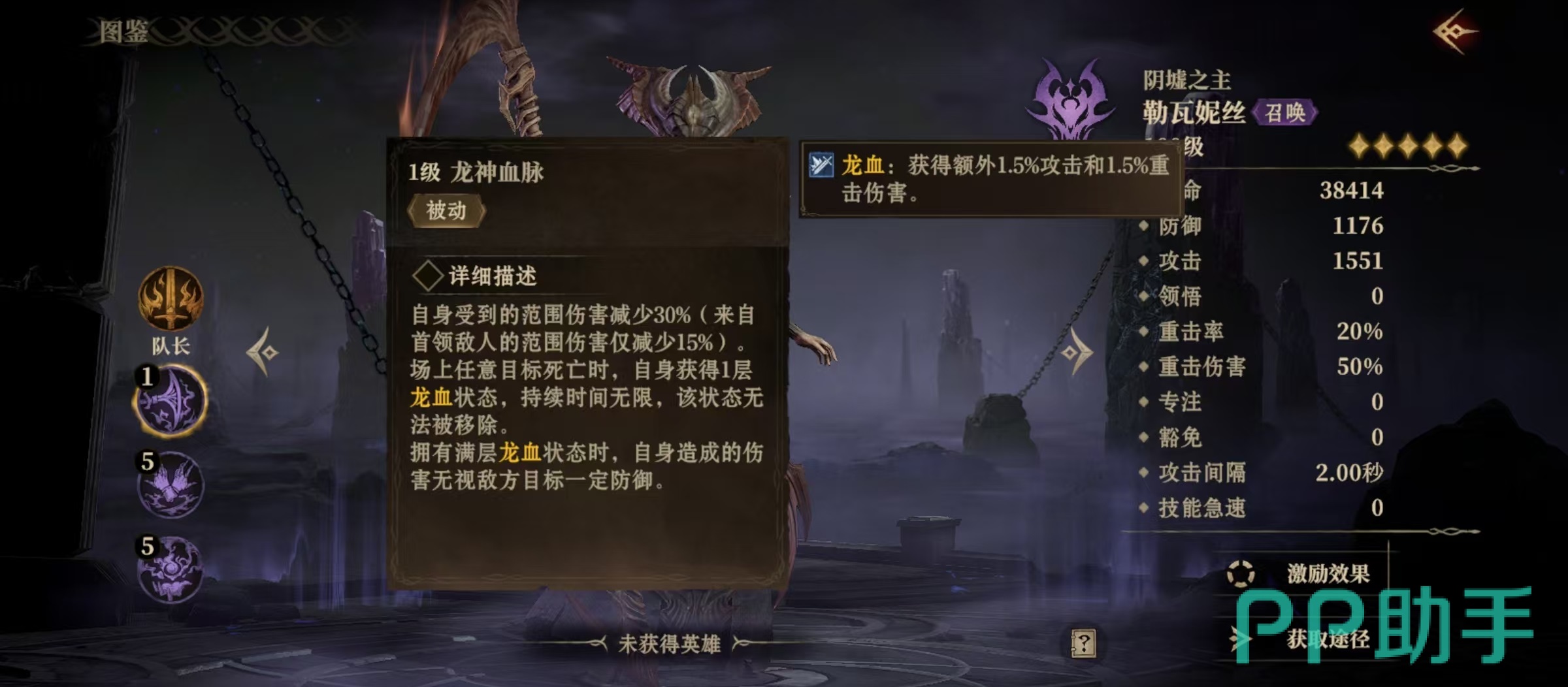 黑龙勒瓦妮丝的队长技能为重击伤害光环,只有在大角斗场中才能生效,提升所有己方单位45%重击伤害,所以是一名很适合在大角斗场中发挥威力的角色。被动减少自身受到范围伤害,当场上任意目标死亡时,都能获得一层龙血状态,持续时间无限,当叠加达到满层的时候,满层龙血的状态下,自身造成伤害可无视敌方目标的部分防御,每一层龙血能够额外提升1.5%攻击和重击伤害。