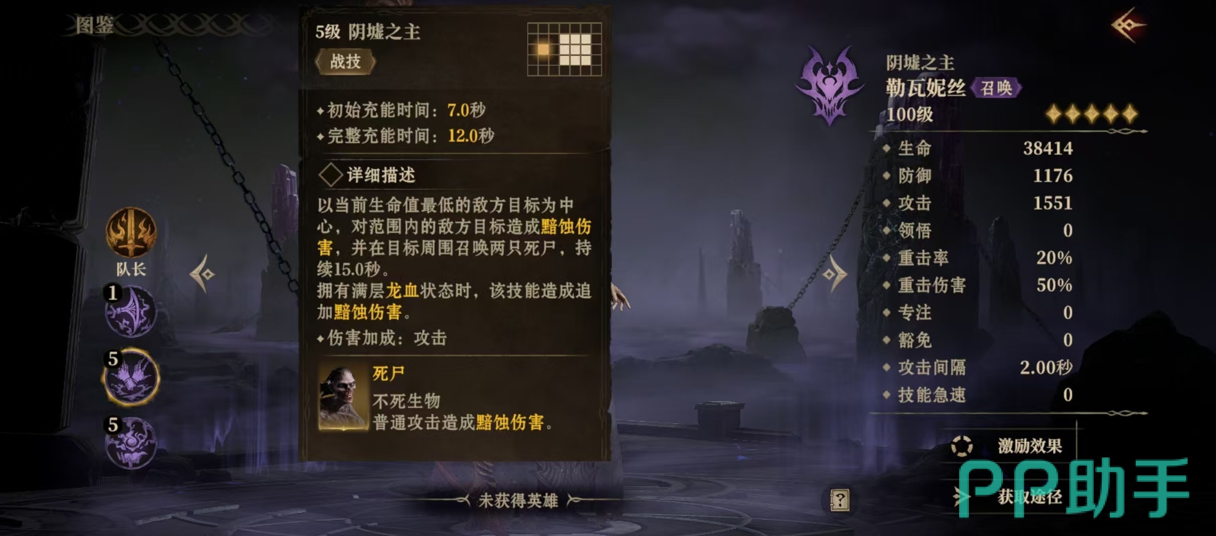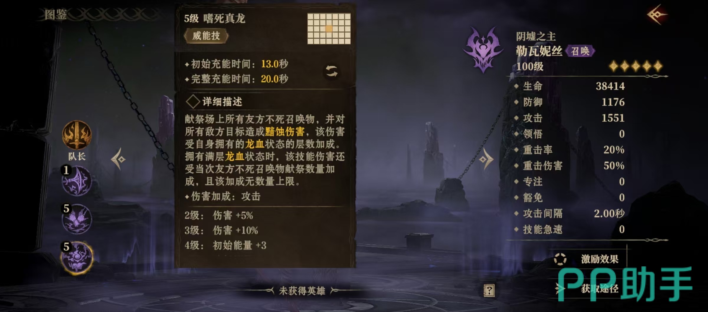 战技效果是选择对方血量最低的为目标,以其为中心造成范围伤害,并在目标周围召唤两只死尸,持续15秒钟,死尸是属于不死生物。大招嗜死真龙,将场上的所有己方的不死召唤物全部献祭掉,对敌方目标造成高额伤害,该伤害受自身拥有的龙血层数加成影响,如果拥有满层龙血,该技能伤害还能受己方不死召唤物献祭数量的加成,加成数量无上限。