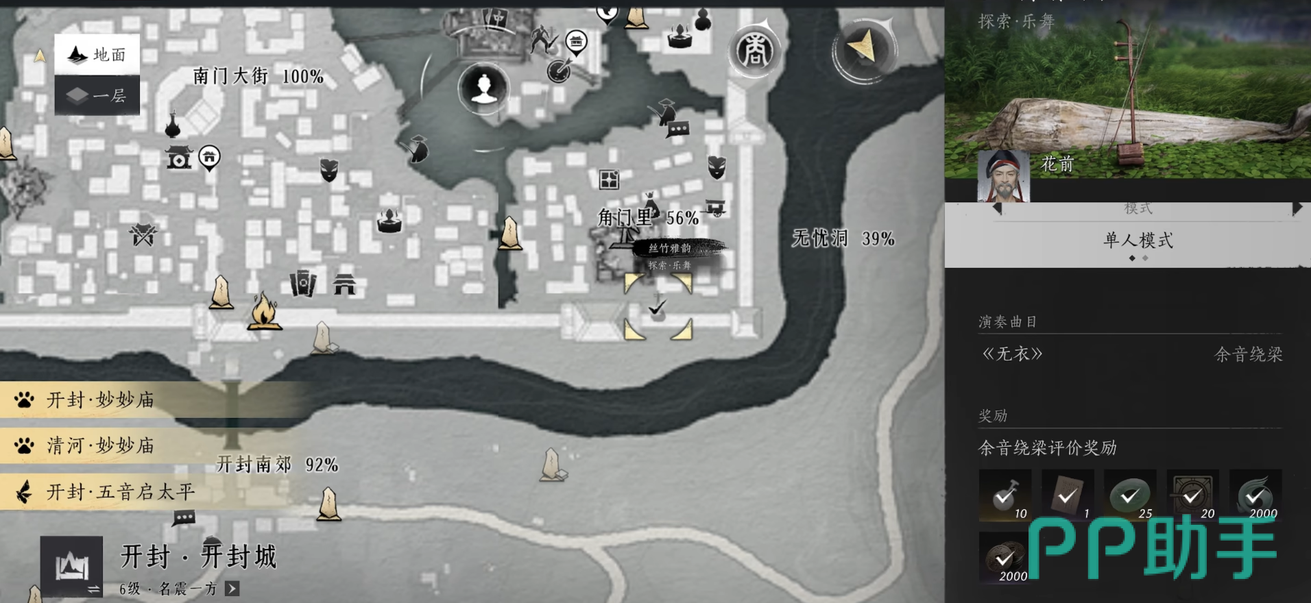 第三张乐谱隐藏在开封城右下角的角门里,需要玩家找到NPC花前。与花前对话后,完成一段《无衣》的演奏任务,就能顺利获得最后一张乐谱。这部分任务不需要特殊技能,只需按照提示进行操作即可。尽管获取过程看似简单,但需要玩家对开封城的地图足够熟悉,才能节省寻找时间。完成任务后,三张乐谱就正式集齐,玩家可以返回折笑处提交任务,解锁这把充满韵味的二胡。