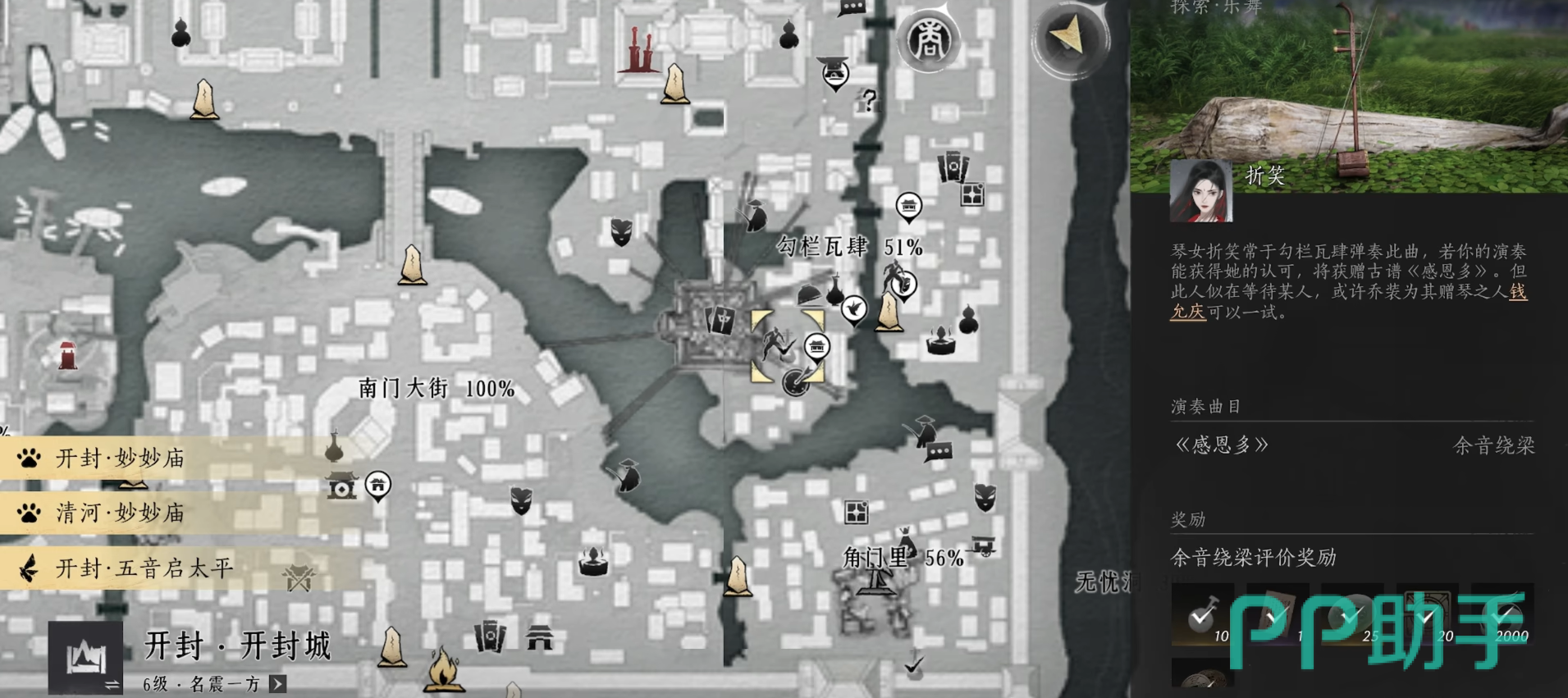 在游戏中,解锁二胡的关键在于收集三张乐谱。每张乐谱对应不同的任务与挑战,分布在地图的各个角落,玩家需要细心探索。第一张乐谱的获取需要前往开封的勾栏瓦肆,找到NPC折笑并完成相关任务。注意,这个任务要求解锁乔装技能,玩家需乔装成钱允庆才能顺利进行任务。通过系统的追踪功能,玩家可以轻松定位到钱允庆的位置。任务完成后,回到折笑处进行互动,就能拿到第一张乐谱。这一过程中还隐藏着一些有趣的小剧情,能够为玩家的游戏体验增色不少。