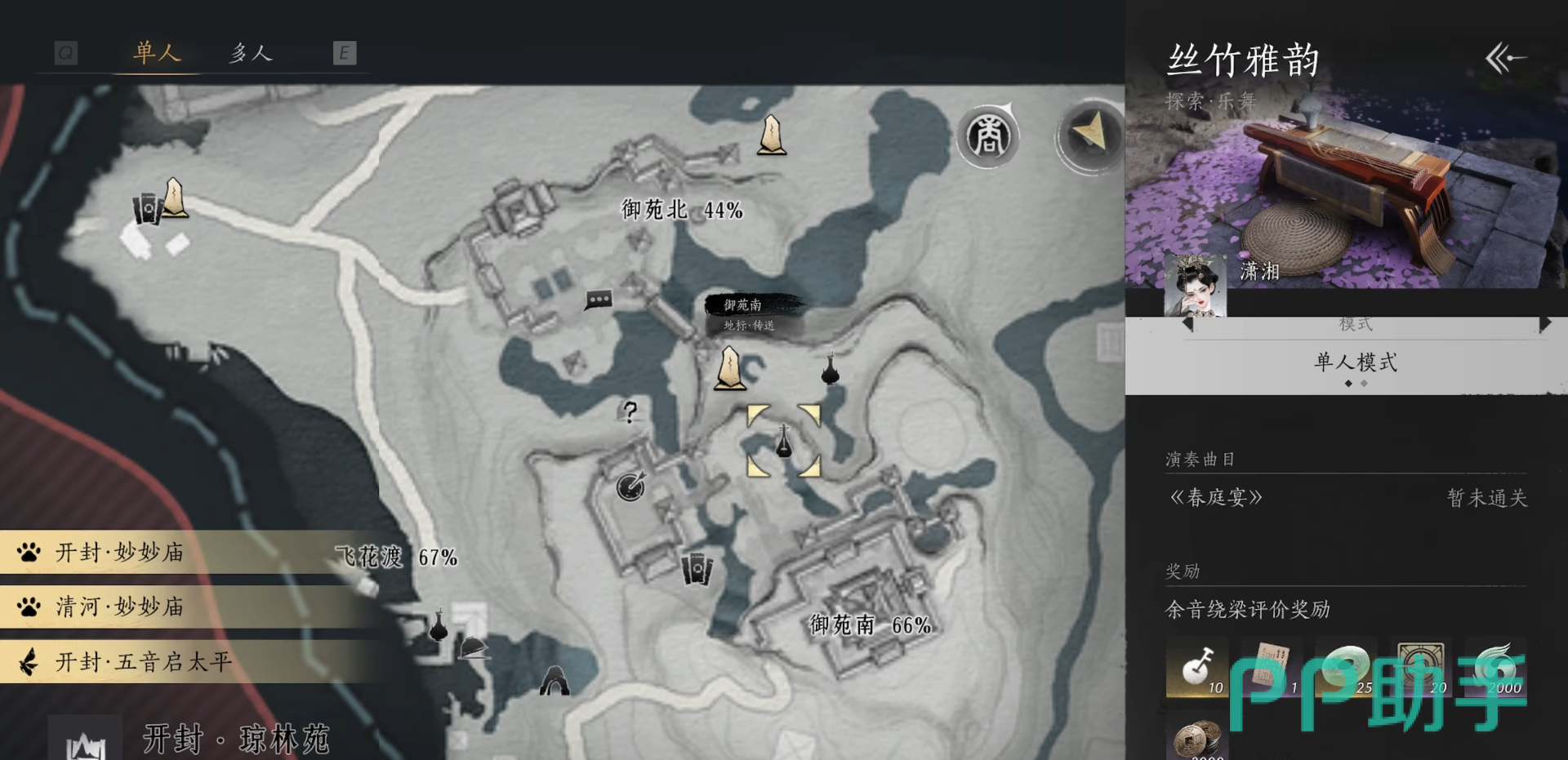 除了这三张乐谱,还有一张额外的乐谱需要大家去获取。各位小伙伴可以前往御苑南的传送点,找到NPC潇湘,聆听她演奏《春庭乐》。这张乐谱虽然不是解锁古琴所必须的,但获取过程也并不复杂,完成后还能为你的乐谱收藏添上一笔。