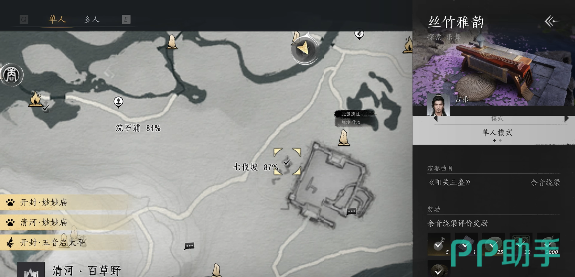 接下来,第二张乐谱需要玩家前往七伐坡的北盟遗址传送点附近。在那里,大家可以很容易的找到NPC古乐,聆听他演奏的《阳关三叠》。这一任务同样只需简单的互动操作,耐心等待演奏结束后便可以成功获取第二张乐谱。不过需要注意的是,七伐坡的地形较为复杂,建议各位小伙伴在传送后留意地图的指引,避免浪费时间。
