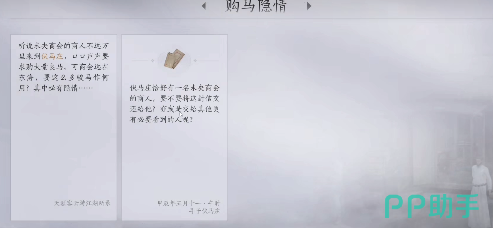 接下来,将信件交给未央商会的从不问。这名NPC通常会在伏马庄附近活动,找到他后与其对话,就可以正式接取“购马隐情”任务。任务的开端可能显得比较简单,但随着剧情的深入,玩家将逐步揭开一段关于马匹走私的秘密故事。原来,伏马庄部分马匹的来源并不正规,竟是通过非法途径从遥远的边疆走私而来。任务的目的,就是让玩家搜集更多的证据,揭露这一不法行为。