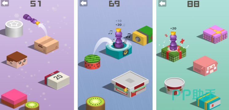 《开心跳一跳》这款游戏的内存虽然小,但玩法却十分有趣,开局你需要控制一个小方块在不同的平台进行跳跃,而这个跳跃模式也是有技巧的,你需要精准地计算出一个平台与另一个平台的距离,然后通过长按的方式来确定跳跃的力度。随着游戏的不断深入,平台间的距离会越来越大,难度也会逐渐增加,除了基础的方块平台以外,游戏内还有一些障碍物,比如炸弹和闪电等,玩时间要注意并采取相应的措施。