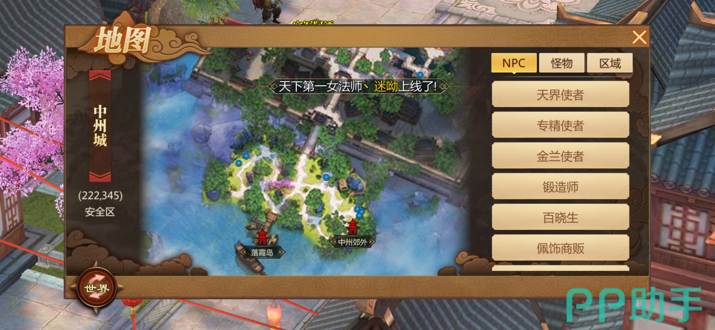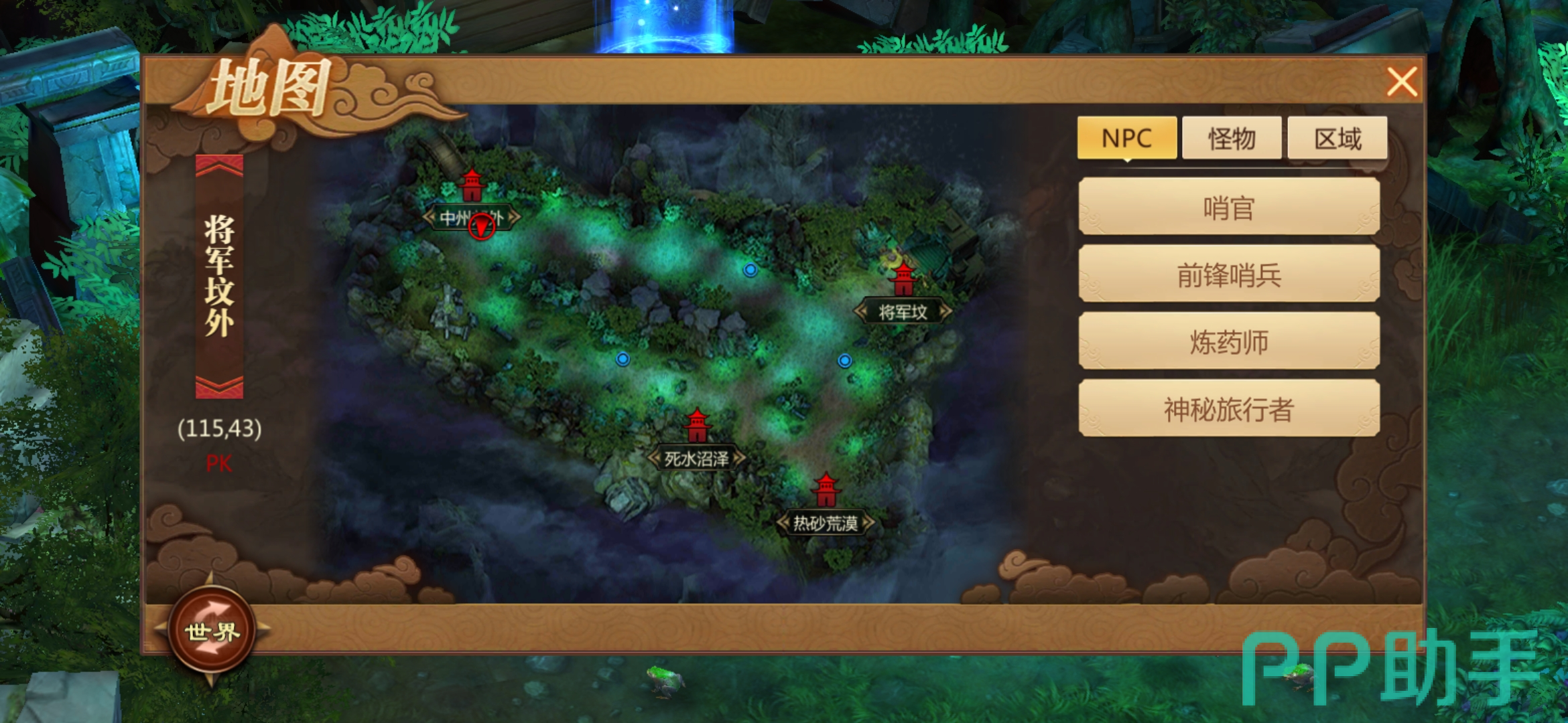 我们先来打开世界地图看一下蛇洞的位置,点击界面右上方的小地图,这时候出现在我们眼前的是当前的地图全景,选择界面左下角的世界按钮就可以切换到整个世界的地图了。