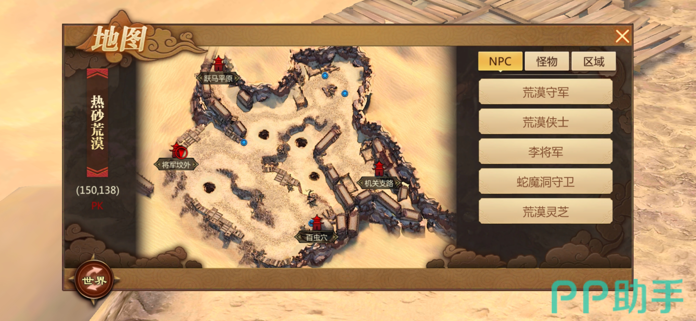 看来只剩热砂沙漠这一条路了,马上出法前往热砂荒漠,来到热砂荒漠一看,怎么没有去往蛇魔洞的路那,不要着急,大家在热砂荒漠的地图上看到一个叫百虫穴的图标,我们先来去百虫穴看看。