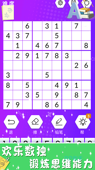 这款游戏它要求玩家巧妙地将数字组合起来,确保每个数字都不重复,从而完成整个数独盘面。游戏界面简洁大方,在游戏过程中,我们可以随时使用返回键回到之前的步骤,或者用橡皮擦功能去掉错误的数字。而且游戏里包含了成千上万种数字谜题,保证让大家玩得尽兴,挑战不断。游戏模式新颖特别,每个玩家都能在这里找到属于自己的挑战和成长。