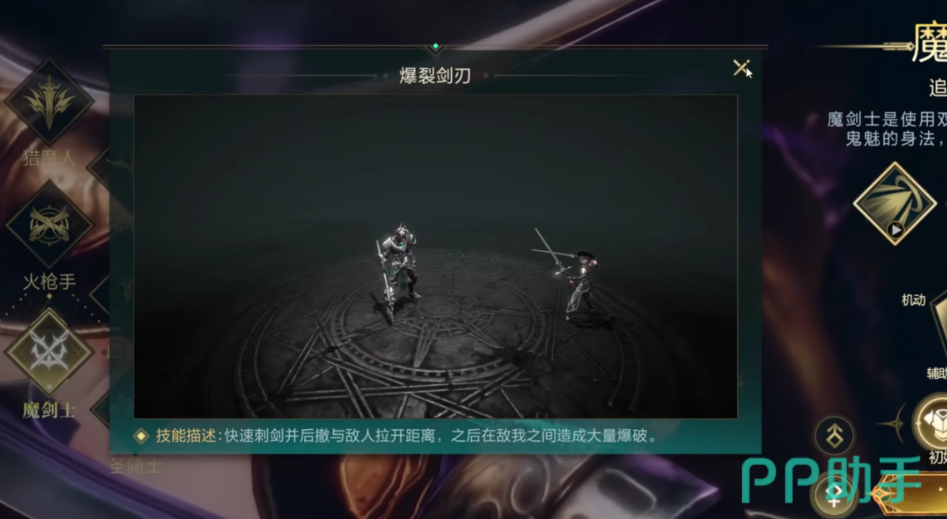 猎魔人在游戏当中主要有三个技能,第一个技能为巨剑连续劈砍技能,当猎魔人命中敌方目标期期间,可以进行一次判定,若判定成功,猎魔人会对敌方目标造成四次连续的劈砍效果,该劈砍效果附带有穿透性,在第四次劈砍期间,穿透率会增加到100%,并且造成大量的伤害。