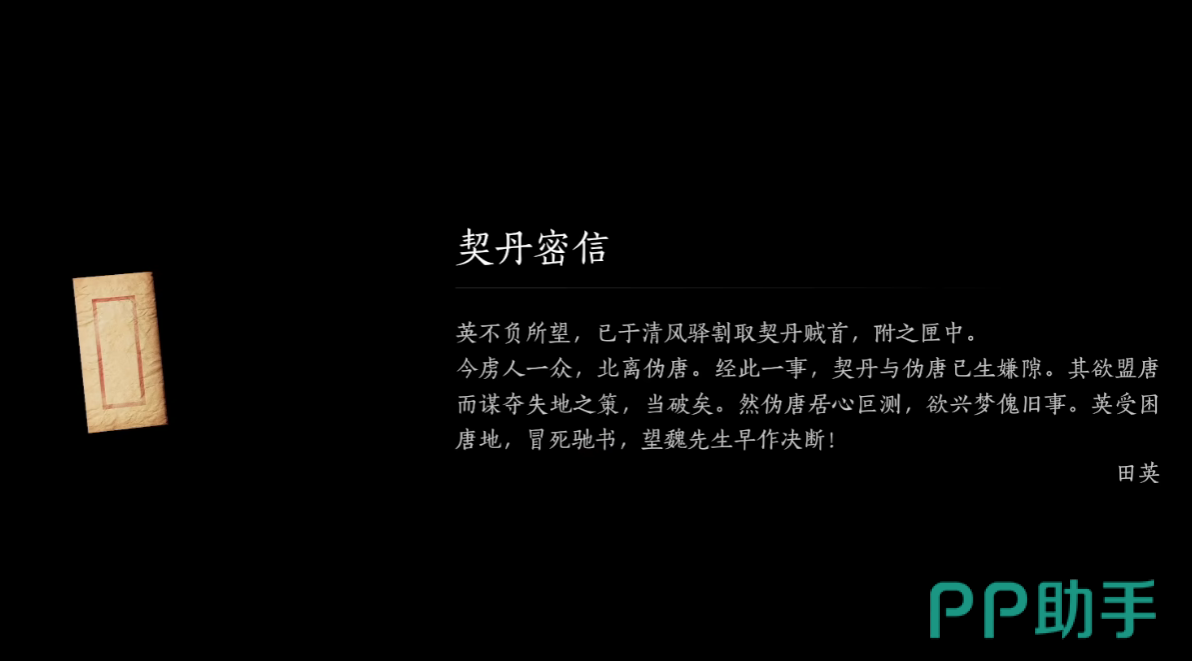 在了解褚清泉的同时,玩家也可以了解到在游戏当中的一些基础设定,例如玩家在地穴当中会获取一封密函,这是契丹密信,契丹此时已经南下,决定与唐展开战斗,而此时,由于十六州的混乱,各路英豪层出不穷,都想要收复中原,其中就有烟云七雄出世,烟云七雄的首领是田英,田英和寒姨以及褚清泉一系的人,都是燕云混乱历史文化当中出现的豪杰。
