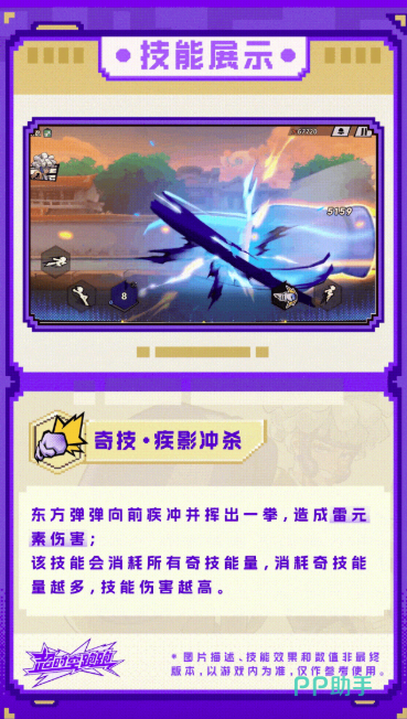 合纵雷霆追是他最后的技能,在小队任务当中是有着非常重要的作用,当小队中任意一个角色释放奇技能时,东方弹弹可打出一拳造成雷元素伤害,使敌人受到的伤害值全部提升20%,并且持续时间长达30秒。