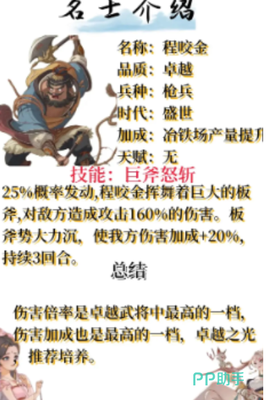 程咬金主要负责的是冶铁场的产量,在游戏当中,程咬金的技能是巨斧怒斩,一旦发动之后将会给敌人造成160%的攻击伤害,额外还可以给自己队友提高20%的加成。