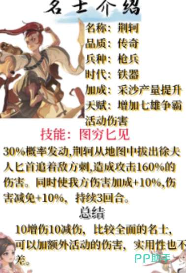 而t2梯度的名士主要分为荆轲,程咬金,燧人等等。在这些名士当中,荆轲主要是提升采砂的产量,而他在游戏当中的技能是图穷匕见,一旦释放之后,他能够给敌人造成160%的攻击伤害,由于他是一个比较优秀的攻击类型的名士,能够增强自身队伍10%的伤害加成。