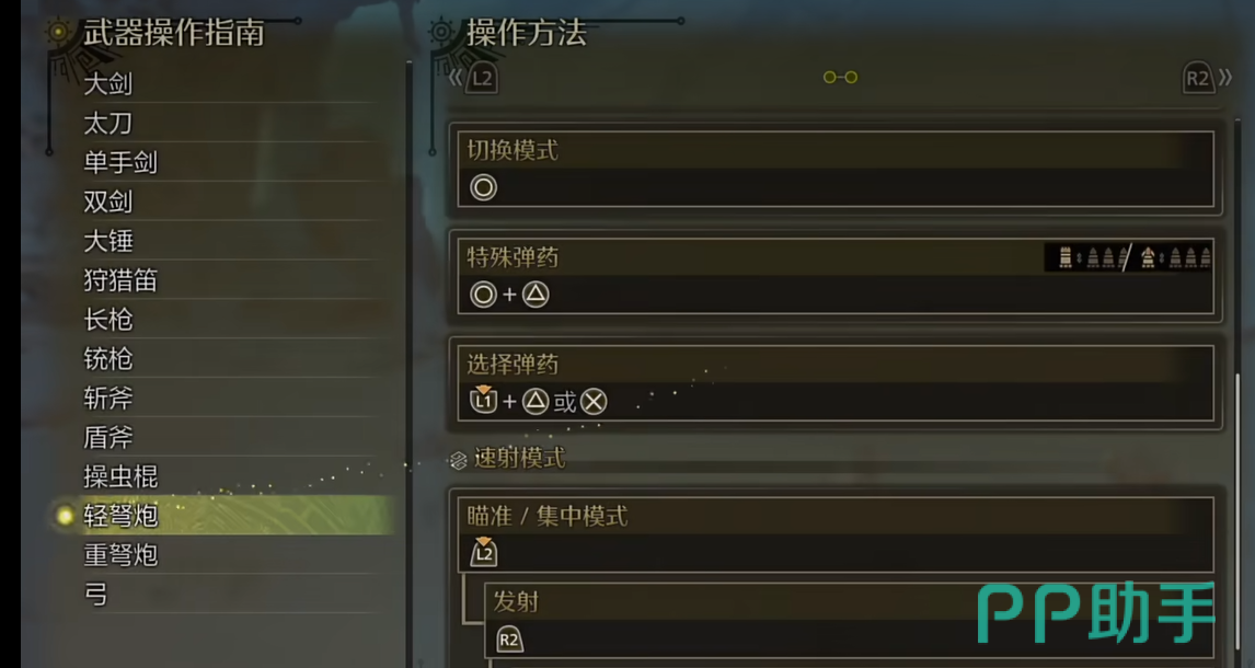 首先,我们来看看轻弩炮的基本操作。在使用轻弩炮时,按住LT键进入瞄准模式,镜头会自动锁定怪物方向,保持对目标的持续注视。你可以在移动中调整角度,灵活地找到最佳射击时机。射击时,按下RT键即可发射子弹,轻弩炮的射速非常快,短短几秒就能打出一串子弹,迅速造成伤害。此外,如果需要切换弹药类型,可以通过长按LB+Y或LB+A来快速切换不同类型的弹药。例如,面对远程的巨大怪物,选择贯通弹穿透敌人,而面对小型敌人,散弹无疑是最好的选择。