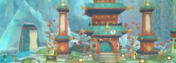 然后,回到船上找到魔镜,选择鲛人村作为目的地,魔镜会瞬间将玩家传送至鲛人村。到达鲛人村后,沿着主路一直往右走,经过几座小型建筑和珊瑚礁,不远处就能看到一座高大的金龙石像。
