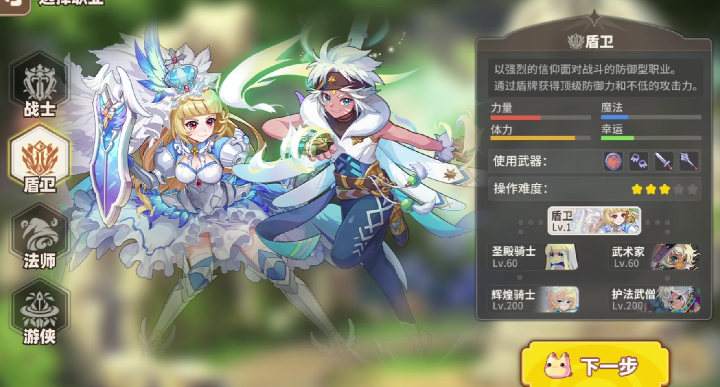 如若玩家的首个职能选用的是盾卫,那么在转阶段时,直接选用圣殿骑士即可,圣殿骑士是纯前排坦克的定位,如若玩家还想要玩输出职能,也可以选择武术家,但是武术家需要在两百级转阶段成为护法武僧之后才能够发挥作用。