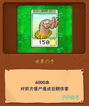 世界之手:初始就有6000血的卡牌,可以对前方僵尸造成巨额伤害,是三张炼狱卡当中最弱的一张卡,但是相比其他品质的卡依旧是有吊打能力的,属于近战爆发的植物,可以无视大规模的僵尸潮,效果可以去单挑僵尸王博士。