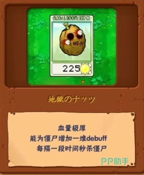地域坚果:是所有炼狱卡当中最强的一个,血量极厚,能为僵尸增加一堆debuff,每隔一段时间秒杀僵尸,高达两万四的血量,让本身就是防御型的坚果有更强的前排抵御僵尸能力,但是弱点就是遇到巨人僵尸握锤子的话,有几率在几次锤击下被锤扁,所以这一点大家要注意在有此类僵尸进攻时进行其他防御植物的安排,碾压类攻击就是它比较弱的地方。