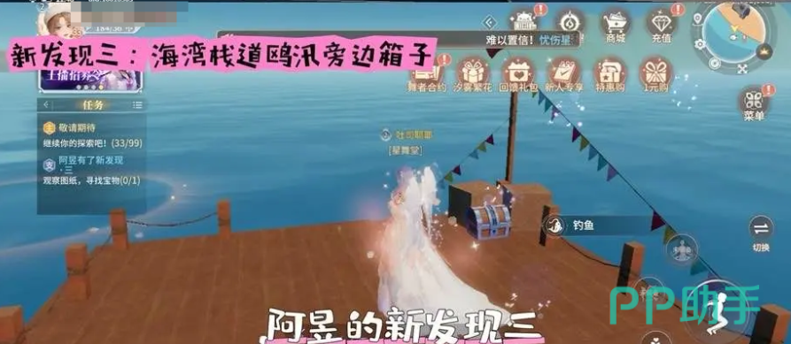 阿昱的第3个发现其实也是箱子,不过这个箱子在海湾栈道欧讯旁边,玩家需要去海湾栈道,然后再找到欧讯旁边的箱子,再直接把那个箱子打开,这时候玩家就可以发现第3个任务已经完成。当玩家找到了三个发现之后代表玩家就已经完成了任务,这时候玩家将会获得金币,经验值,道具等等丰厚的奖励。