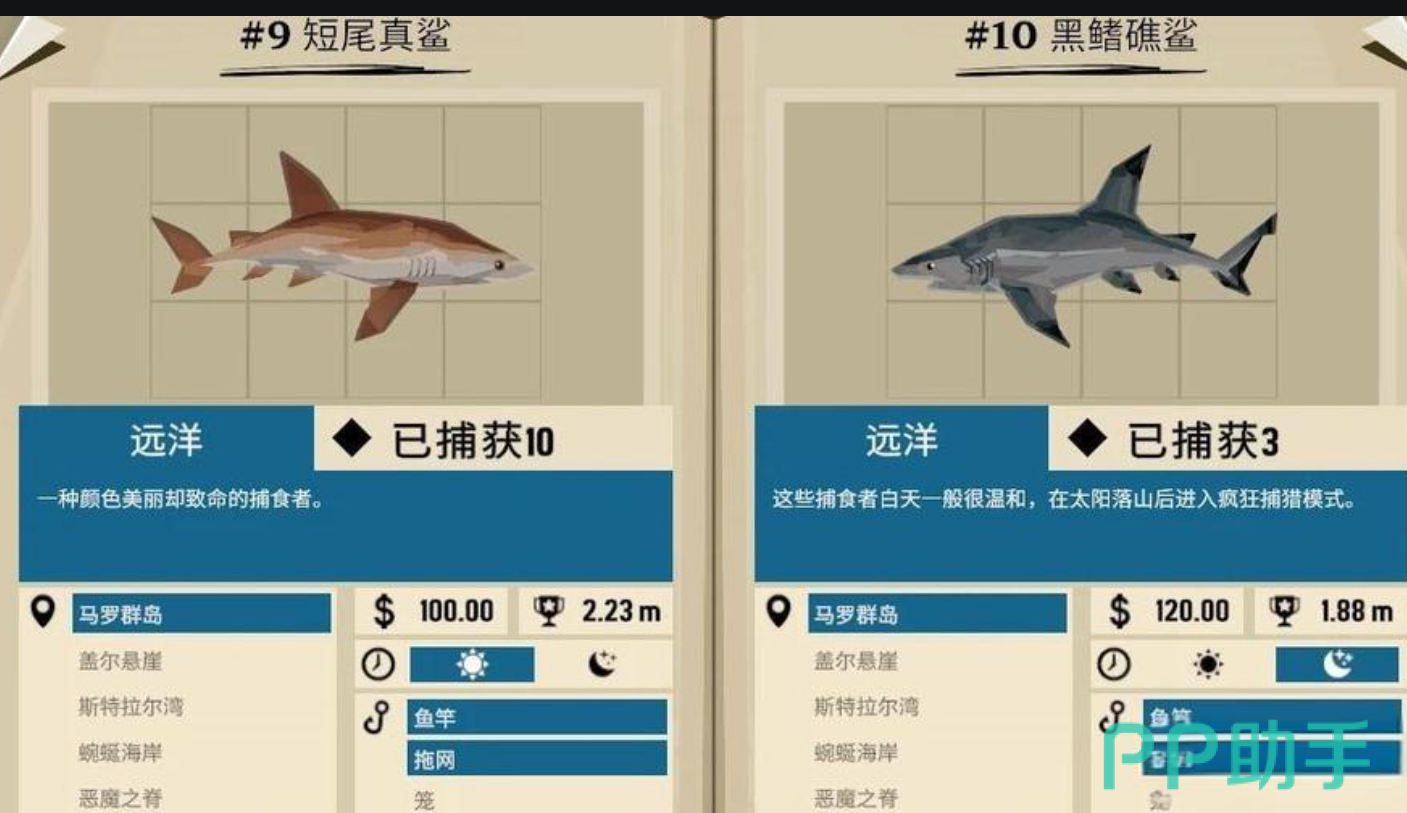 我们在做这个任务时需要找到它们生活的不同水域,黒鳍礁鲨生活在马罗群岛的远洋处、短尾真鲨和黒鳍礁鲨一样都生活在马罗群岛的远洋中、锤头鲨生活在斯特拉尔湾的远洋区、魔鬼鲨生活在恶魔之寂的深海区,这四种鲨鱼我们都可以使用鱼竿或者是拖网去打捞。