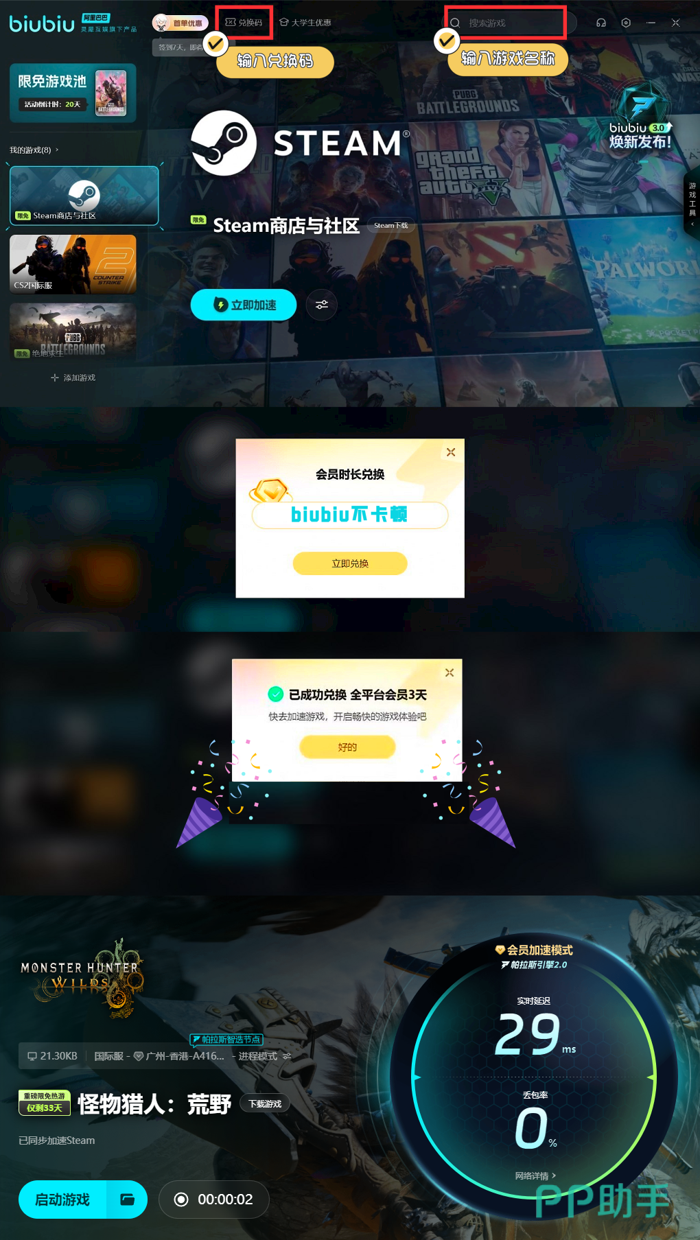 正如呆猫是玩家战斗的好伙伴,在新作的多人战斗中,一款好的加速软件更是我们游玩时的得力帮手,能在联机的时候保持稳定,这里建议大家使用biubiu,用它来玩怪猎荒野不炸房,更是可以通过兑换码“biubiu不卡顿”获得3天会员。