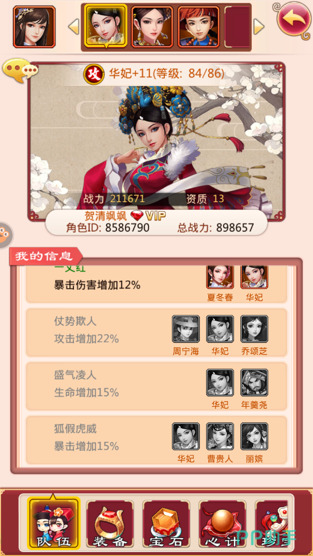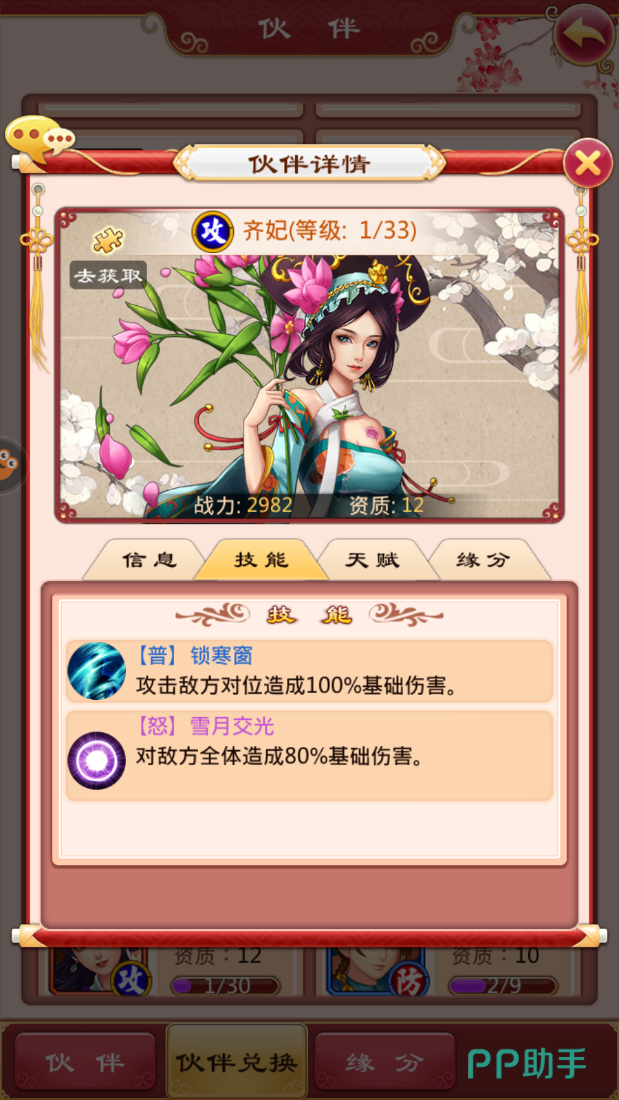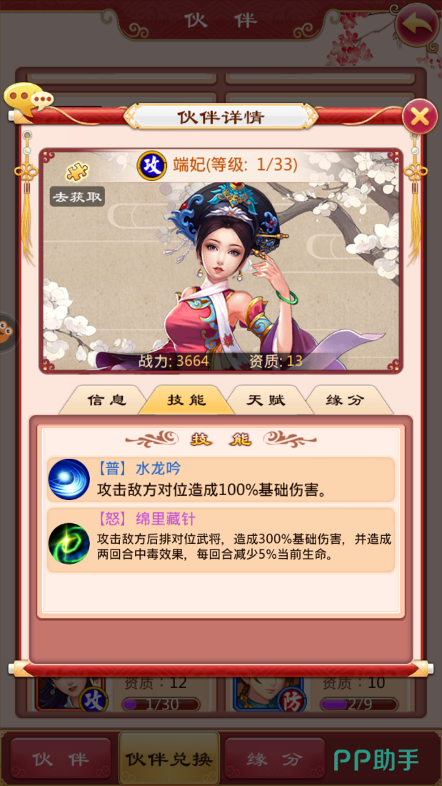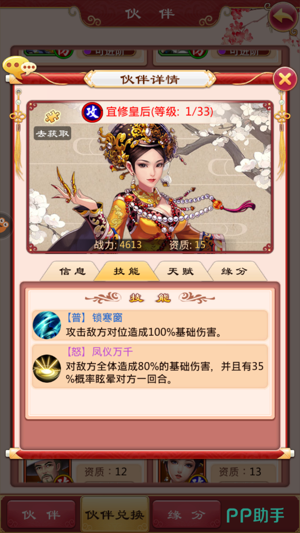 4、宜修皇后,这个伙伴是游戏中最顶级的伙伴,资质高达15,但是获取也是比较难的,主要还是看运气了,如果有的话,一定是上这个,直接是伤害碾压,可以造成全体的秒杀效果。