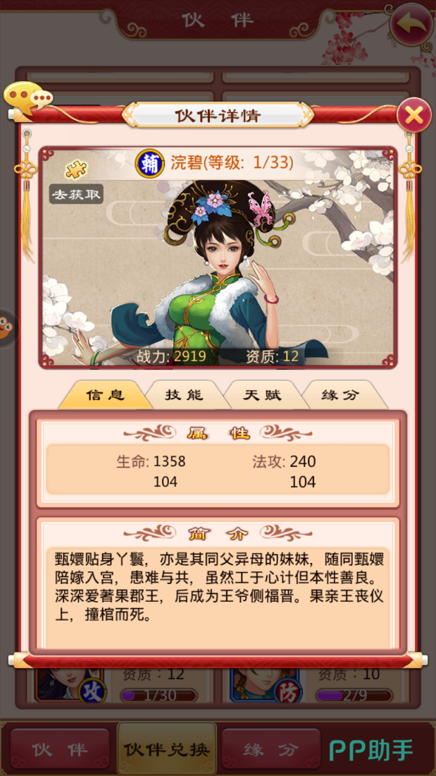 2、浣碧,主要是提高我们输出的一个辅助,并不是加血的,大招是对对方造成伤害,而且可以增加己方随机一名队友15的怒气,在战斗的时候可以更快的触发大招。