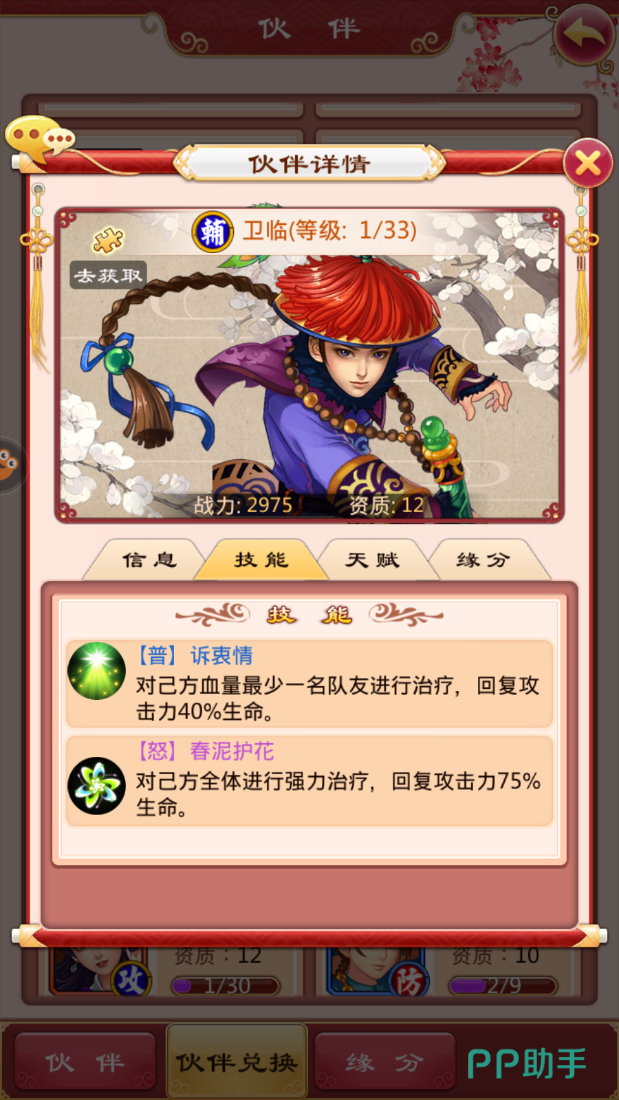 1、卫临,首推的一个辅助选择,资质虽然为12,但是技能的效果十分的不错,大招是可以对全体的队友进行治疗,可以恢复攻击力百分之75的生命值,而且获取的难度也不是很高,出的几率比较大。