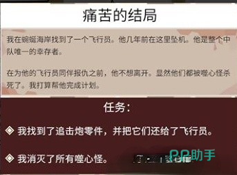 可怜飞行员的遭遇你本想带着飞行员一起离开,可是飞行员却坚决不肯离开,并表示自己要报仇,原来多年前发生的拿起飞机坠机事件,原本有着很多幸存者的,可这些幸存者都被海岸行的噬心怪给杀死了,这名飞行员之所以一直没有离开就是为了给兄弟们报仇。