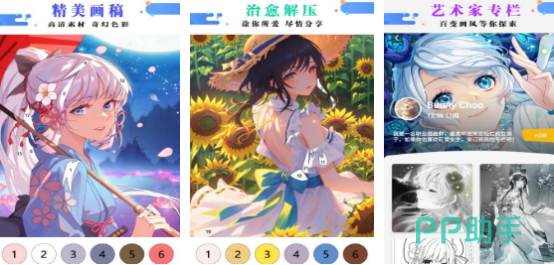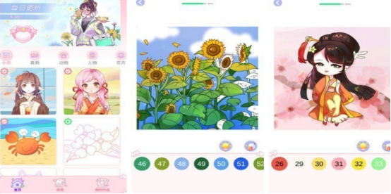 比较热门又简单的填色涂色游戏,适合不同年龄段,各种图画可分为多种类型,每张图画上都有具体的数字编号,按照数字以及对应色块完成涂色。整个游戏设计非常轻松,也很惬意,最重要的是相当解压。有唯美的画风,可选择自己喜欢的美女角色,又或者是动漫场景风景等等,涂色之后可直接保存到本地,还能分享给其他好友。
