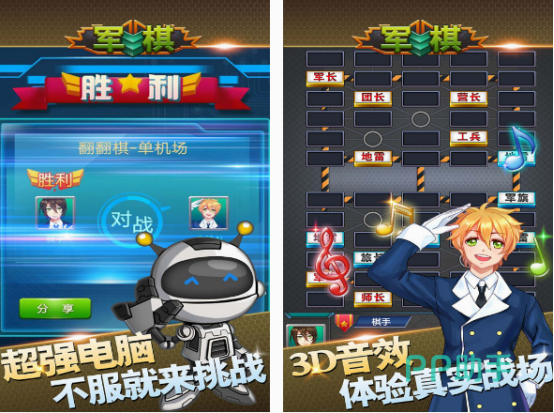这款以下军旗为主的游戏中,有3d的音效,仿佛进入了真实的战场。既有经典的单机玩法,你可以与人机展开对战,同时还有双人对战模式,给大家提供了多种难度。无论是以逆时针或者是顺时针这样的走棋顺序为主,大家都能在这里面享受非常不错的游戏体验。还要想办法的发挥技巧以及智慧,这样才有机会取得最终的胜利。