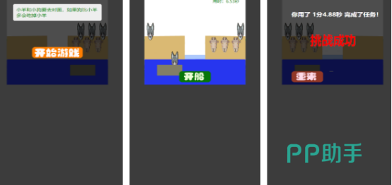 操作简单,考验玩家的思维逻辑能力,具体的核心玩法为将三只小羊与小狗依次送到河对岸,每次运送的过程当中,小狗数量不能超过小羊,不然小狗就会直接将羊儿吃掉,在数量方面确保两者足够平衡,这样才能尽快完成运送任务。但看似玩法操作较为简单,却很考验玩家的逻辑思维以及整体的策划能力。提供超多关卡及不同的挑战模式增加游戏的深度。