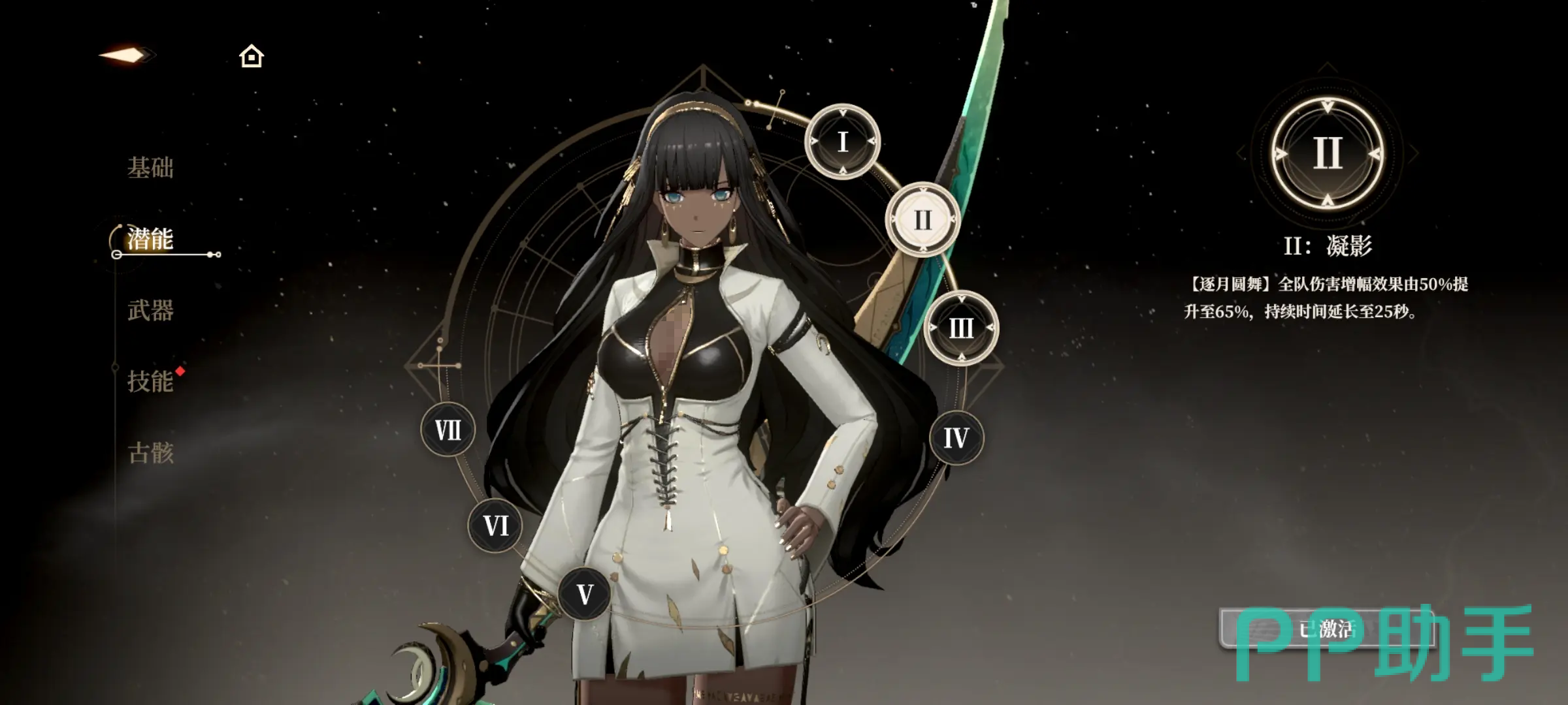 普通攻击”月牙连刃”,分为不同状态来使用,满月时,分四段进行,让对方遭受普攻伤害;新月的状态时,普攻分三段攻击,攻击伤害为99%;蓄力能发动重击,重击伤害为38.5%。”朔影”的闪避技能,完美闪避后点按普攻可反击,造成攻击力为140%的常规攻击。