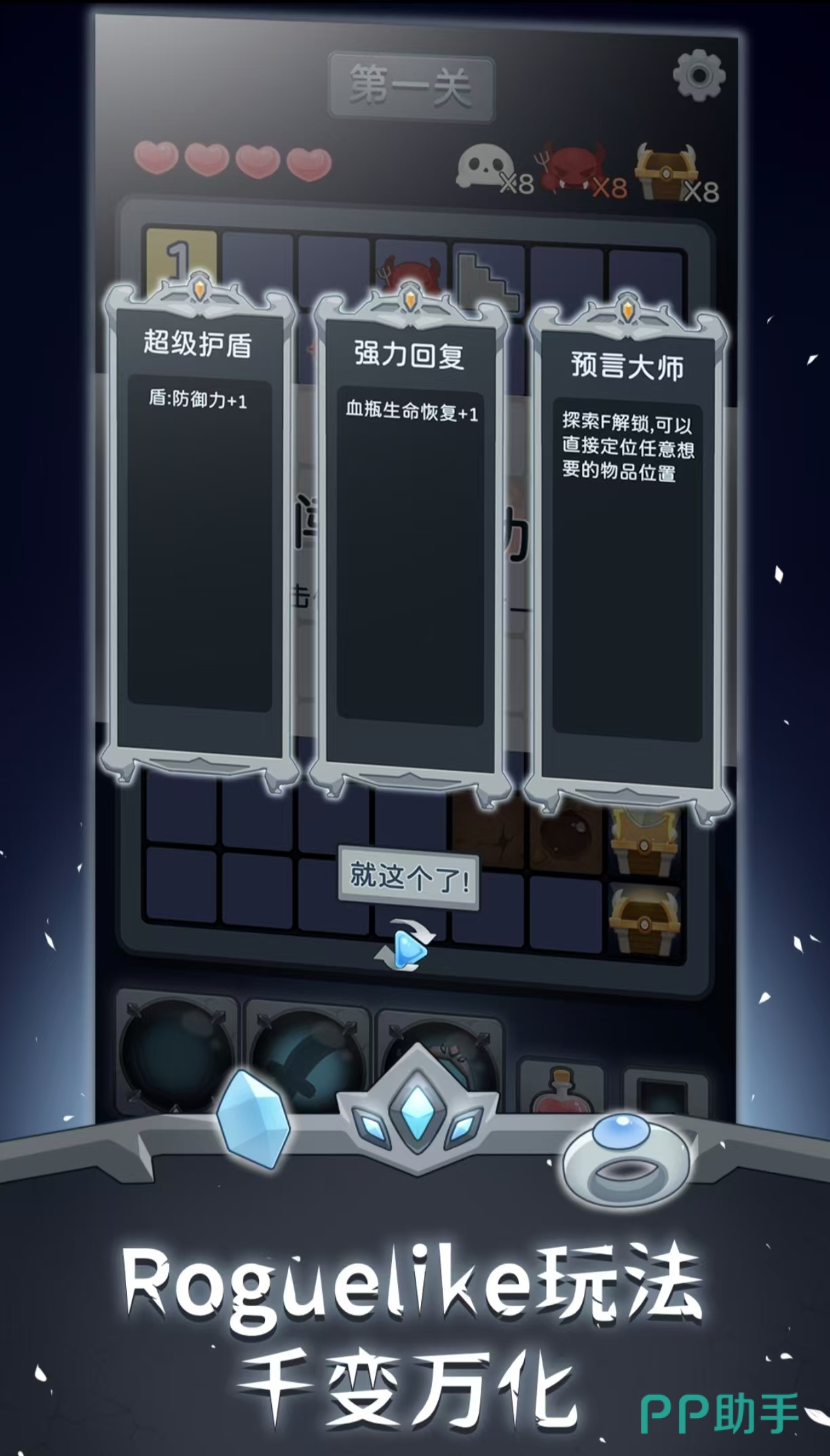 《扫雷勇士》可以进行经典的扫雷,还有地牢探索两种模式,无尽模式里可以随意的去无限扫雷,玩法也进行了全新的升级,玩家可以使用护盾的方式来防御,根据地图上的方块,按照数字排除掉所有的地雷。在地图中除了地雷以外还有宝箱,玩家还需要击败地图上的小怪,每次通关会获得两个宝箱,宝箱里面会有玩家需要的道具,可以恢复玩家的生命值或者是获得碎片。