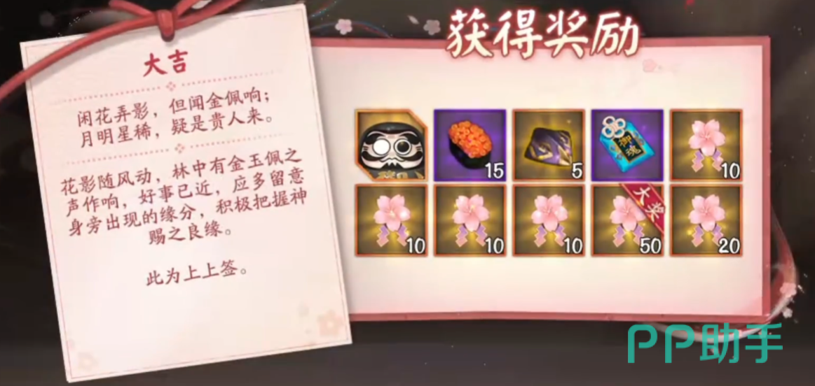 活动期间,可以购买并使用“锦签”来求签,简单说就是抽卡,可以获得结缘樱、御行达摩碎片等奖励。然后用结缘樱在活动商店可以兑换须佐之男和遥念烟烟罗的这两款皮肤,还有对应式神的专属陪伴礼。