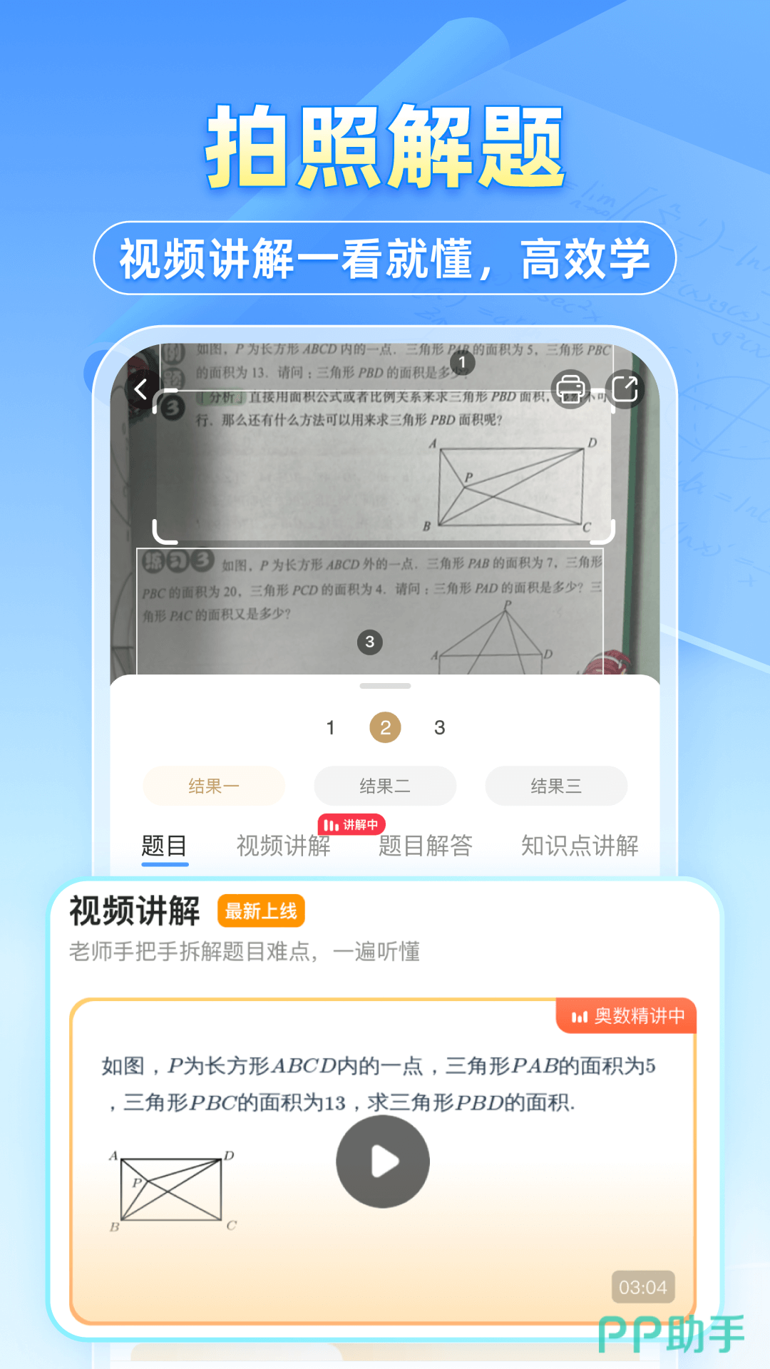作业帮是现在网上教育的一大品牌,拥有超级丰富的大数据题库,为小学生带来更加高效的智能学习环境。主要功能包括搜单题、搜整页和搜作文等,直接出现大量内容,还附带有多种解题方式,作业再也不用愁了。