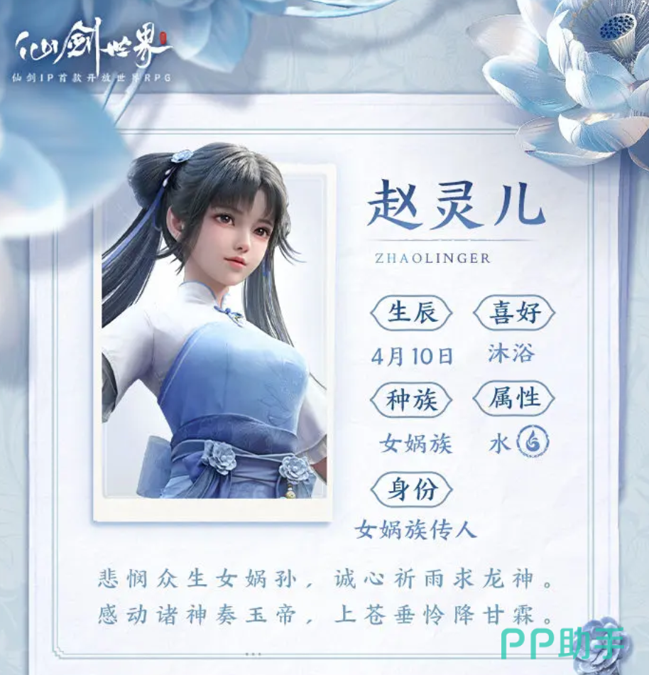 赵灵儿是女娲族的后人,他从小过着与世隔绝的生活,是水属性的角色,而李逍遥闯入了仙灵岛,最后跟赵灵儿结为夫妇。但李逍遥被苗人下药,忘记了赵灵儿,李逍遥在机缘巧合下救了赵灵儿,并且送她回苗疆见母亲。