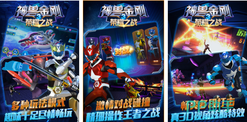 欢迎各位神兽金刚的粉丝进入这款漫改作品开启战斗,创新加入的多段式打击玩法激情四射,多样模式的加持让这款神兽金刚手游更丰富,全面革新的3D视角呈现出华丽的视觉效果,装备、符文等辅助道具让机甲实力大增,还加入了真人PK的热血排位赛系统,可以让屏幕前众多神兽金刚的粉丝尽情战斗。