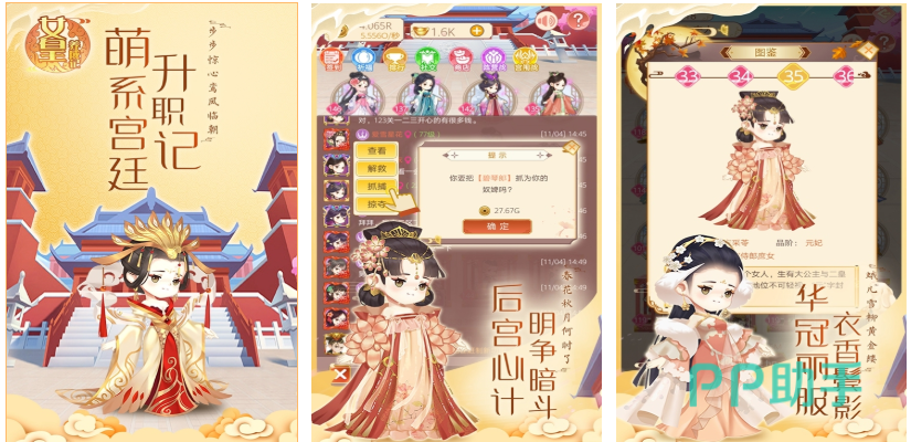 这是款可以培养女皇的后宫主题女性向作品,你会以后宫女官的身份参与宫斗剧情,古风华丽的服装配饰都可自行搭配,也加入了佛系的建造宫殿并扩建的模式,卡通向画风将后宫女眷的造型塑造的很可爱,超多可爱宠物的加入将游戏塑造的更佛系,轻松休闲的宫斗模拟玩法更让女生玩家满意。