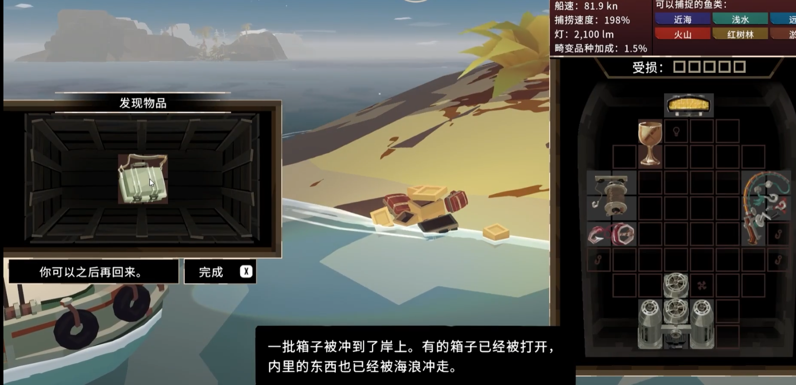 可以看到小岛的岸边有一个闪着光的箱子,将它带上回到之前摄影师的所在地,将其交给这个摄影师,就可以从她那里得到备用照相机,同时解锁技能“镜头”,用它可以拍摄风景。同时与这个摄影师对话还可以了解到附近海域的鱼类分布。