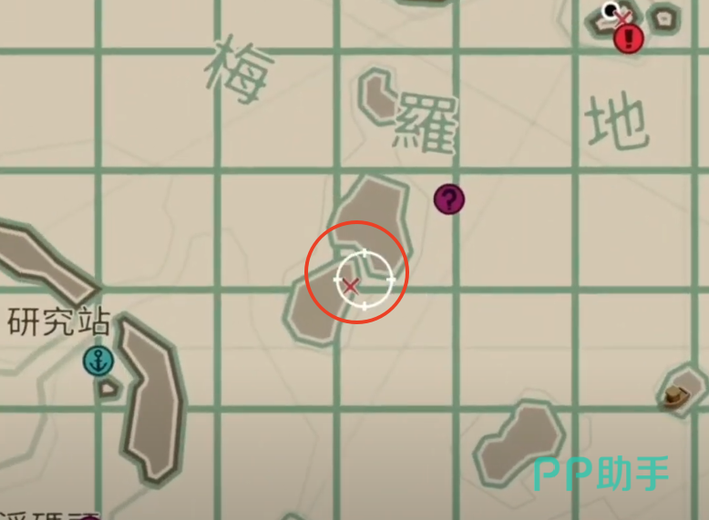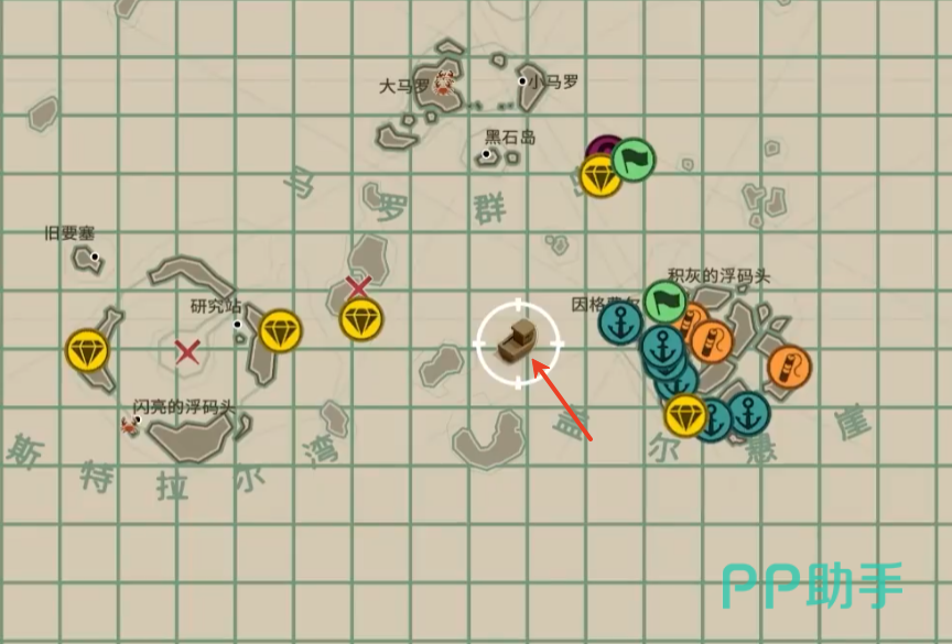 如图所示,这个点位有标记在地图上,大约是在H5和I5之间,刚好可以看到是2个小岛屿之间的狭窄航道。其实这个任务并不难,关键是要看值不值得,这里并不建议大家在夜晚期间特地跑那么远去做这个任务,可以任务先留着,后续到这附近的时候再顺手做一下。