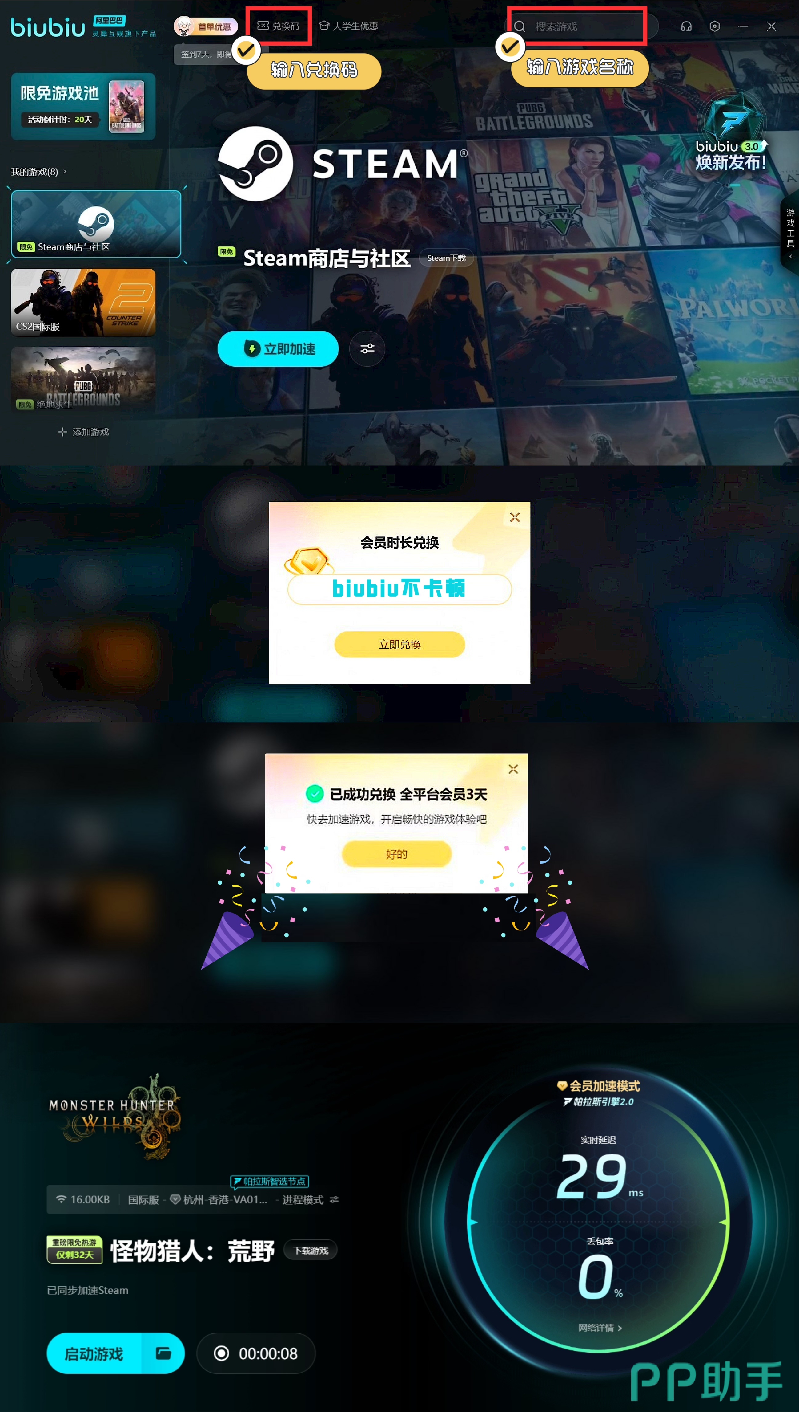 如果说在biubiu的专属游戏福利活动内容中没有抽取到加速时长福利,小编给玩家们分享几个。用口令“biubiu不卡顿”能在加速器的兑换上领取到足足3天时间的加速,如果用户还是第一次使用biubiu的话,在完成注册后能享有新人3h的加速。这些加速的时间对于资深玩家来说,可能已经足够完成多个领域的地图探索内容了。